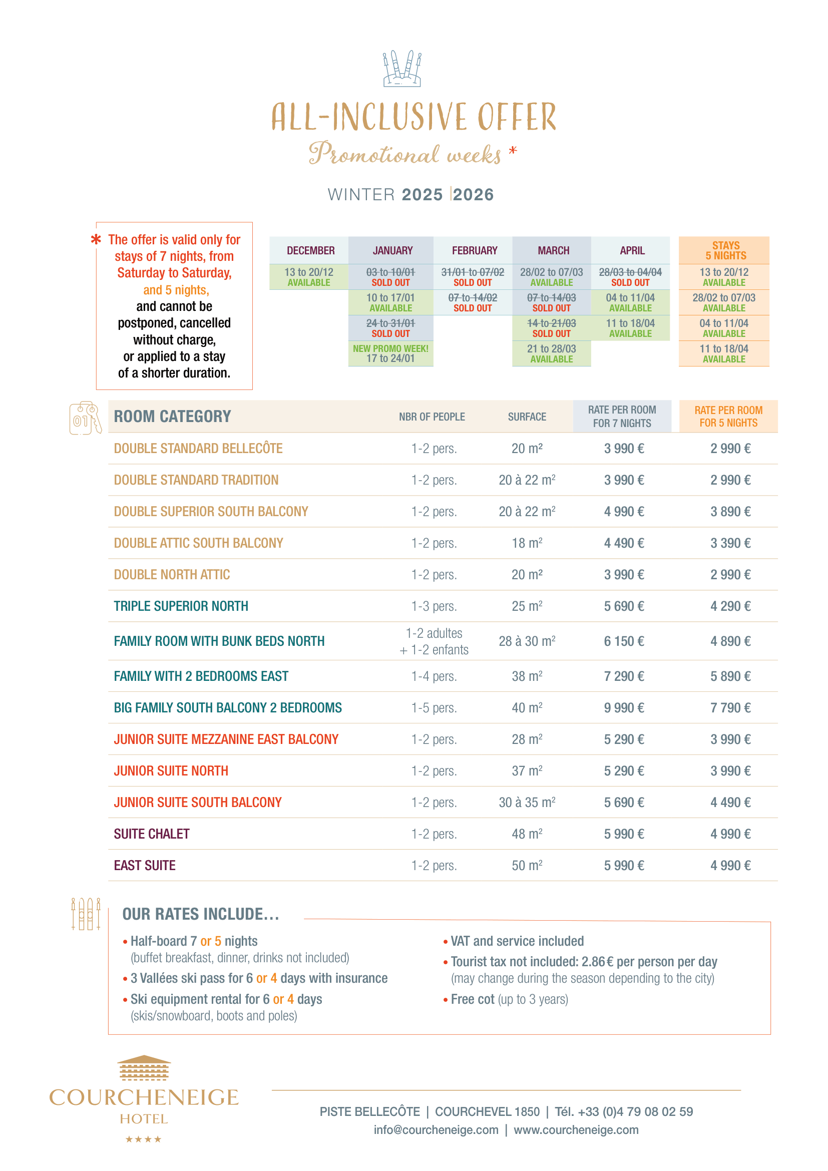 - Minimum 7-night stay from Saturday to Saturday in double, triple, quadruple or quintuple occupancy